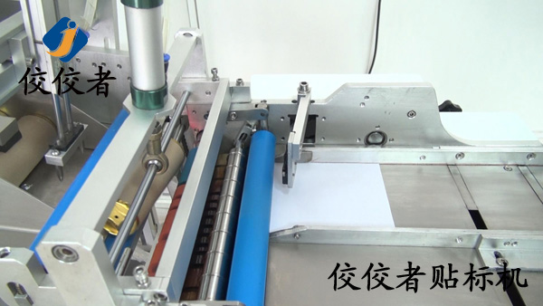 我們一起來看看這臺熱熔膠紙筒貼標機是如何工作的,首先是要在傳送帶上放置標簽,隨著下圖藍色圓柱體下面的鐵質柱體的轉動,標簽向內移動,這邊的紙筒也走到鐵質圓柱體上面,這時紙筒被快速轉動,標簽便貼上了紙筒,如下圖: