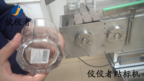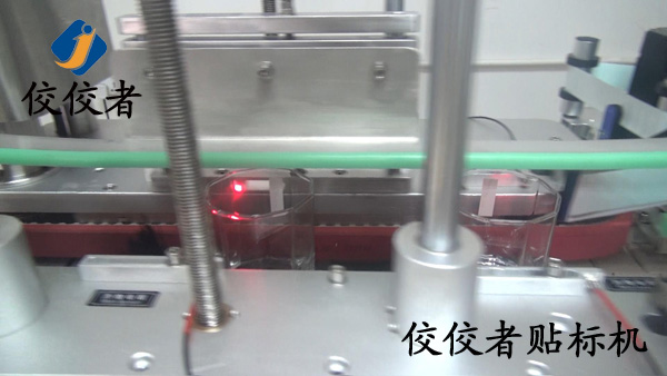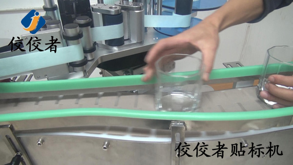下圖展示的是工作人員將需要貼標的玻璃杯放在方便拿取的位置以增加貼標的效率,此時有一個步驟在圖片中沒有展示出來,那就是接通電源.之后需要做的就是將玻璃杯放在輸送帶上,.然后調整好角度,此時貼標過程已經完成.看似只有一秒鐘的時間,在這個時間中,機器進行了一系列的工作,測物、測標、剝標,側面貼標、下面貼標,此時貼標頭貼標,到指定位置,.至此,貼標過程就已經完成了. (操作過程:放產品—>貼標并覆標)—>取出已貼標產品。)如下圖。此圖展示為手工放產品,也可以接流水線,所有與產品接觸的地方為塑膠(非金屬),保證產品輸送過程,起到緩沖,減少振動,保證在貼標過程中產品合格,玻璃易碎難點。