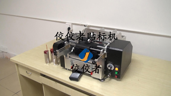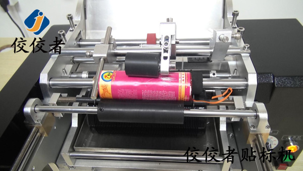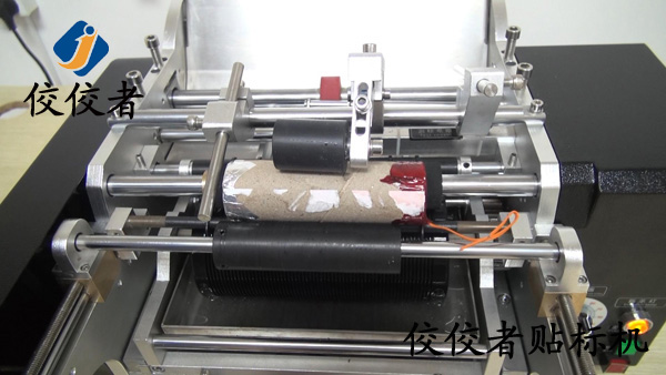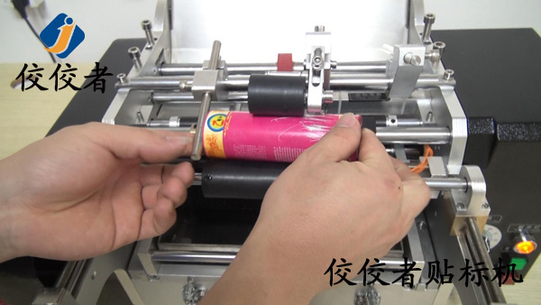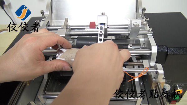 將產品放入到貼標機上放產品的位置,這里可根據產品直徑大小和長短來調整這個間隔,讓產品放上去平穩,然后踩腳踏開關,標簽出標貼標覆標,如下圖: