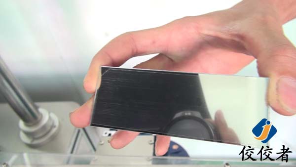 隨手拿出一個鏡片觀察,還別說,速度快不說,關鍵是貼的非常平整,標簽的大小是和矩形薄片基本上一樣大小的,但是并沒有貼錯位的情況,可見這臺貼標簽機的貼標精度是非常高的,如下圖: