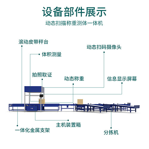 DWS設備其實用中文翻譯過來就是集稱重掃碼。測體積一體的一臺設備。這臺設備可以對接系統,實時上傳數據。如果有需求的話,還可以添加分揀功能,根據您的需求添加多個分揀口,掃碼以后將貨物分揀到您指定的出口處統一管理。