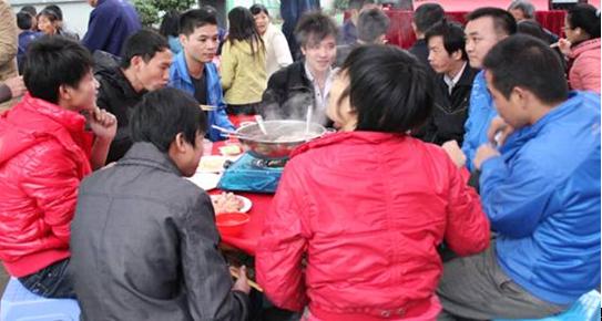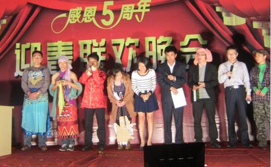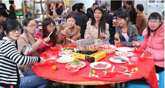 伴隨著一片片掌聲的揚起,我們的后勤部隊把所有吃的東西都搬了上來,晚宴也在進行中。灑桌上,熱湯的沸滾聲、同事們的嘻笑聲以及臺上正再進行的腦筋急轉彎的節目。表情如此多樣。