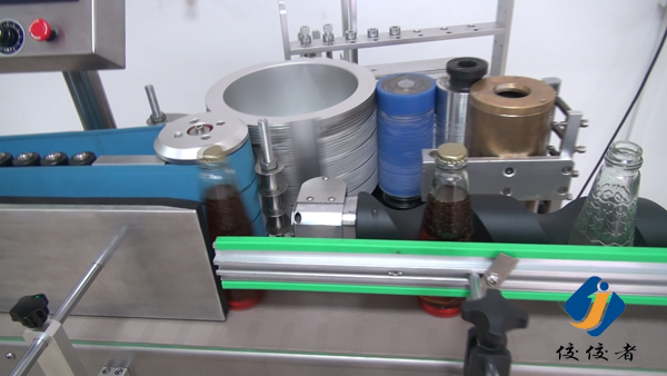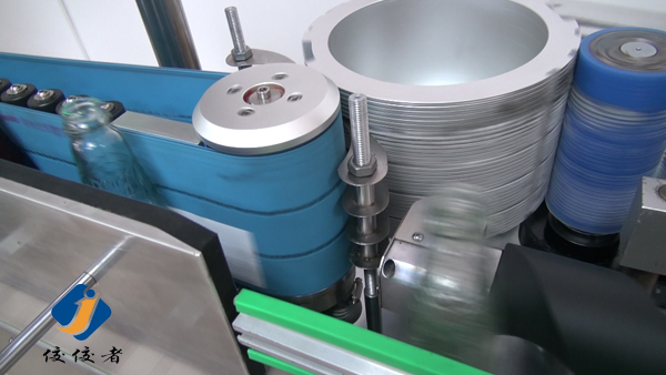 看到上圖中玻璃瓶子后面有一條螺旋狀黑色柱體了嗎?那個圓柱體就把瓶子們的間距調節得與出標頻率吻合,瓶子們被一個個送到下圖這個傳送帶上進行貼標,傳送帶會準確地把已經糊好漿糊的標簽給貼上瓶子,如下圖: